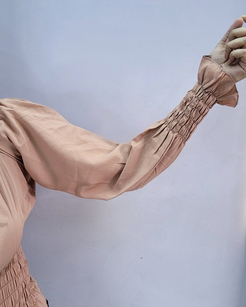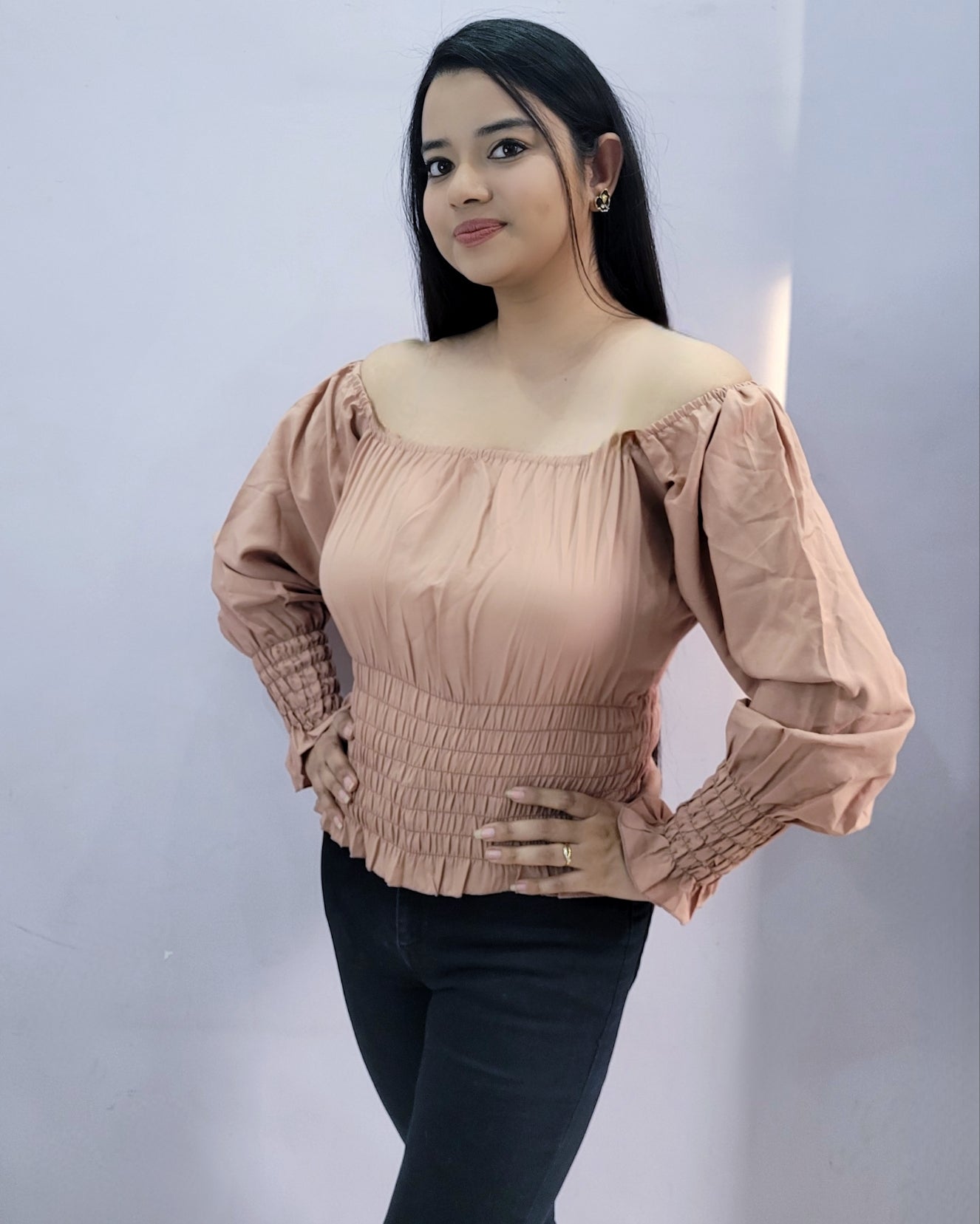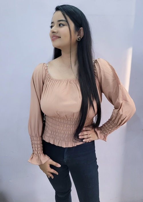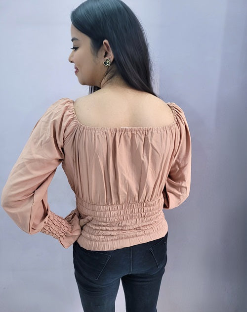Peach off-shoulder top with smoke work at the waist and sleeves.
