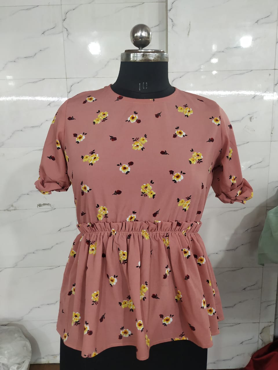 Peach peplum top with puff sleeves and small flower prints.