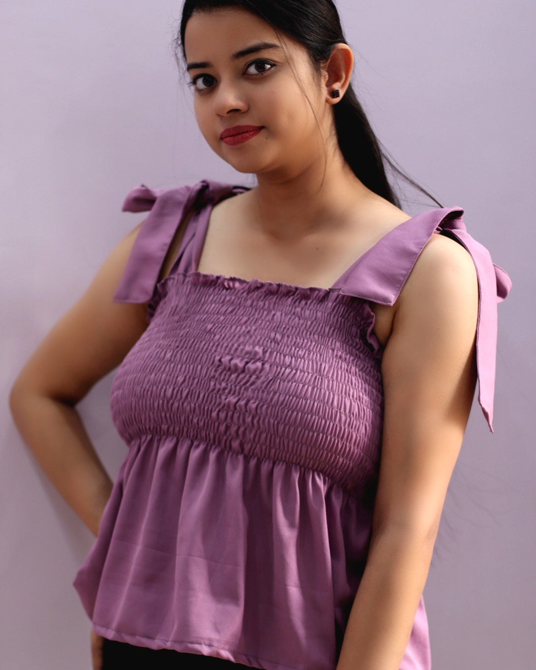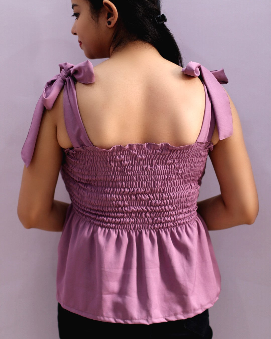 • Styling: Pair this cute lavender knot top with high-waisted jeans for a casual look or a maxi skirt and heels for elegance. Layer with a cropped denim jacket for structure or style with wide-leg trousers for a trendy vibe. Complete the look with dainty jewelry and a high ponytail to highlight the tie-up straps!