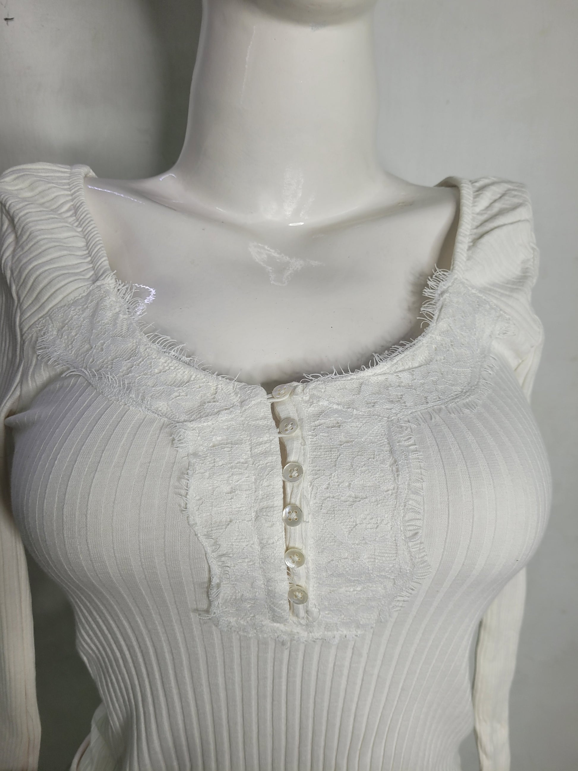 Full sleeves ribbed top with lace work on neck and a scoop neck.