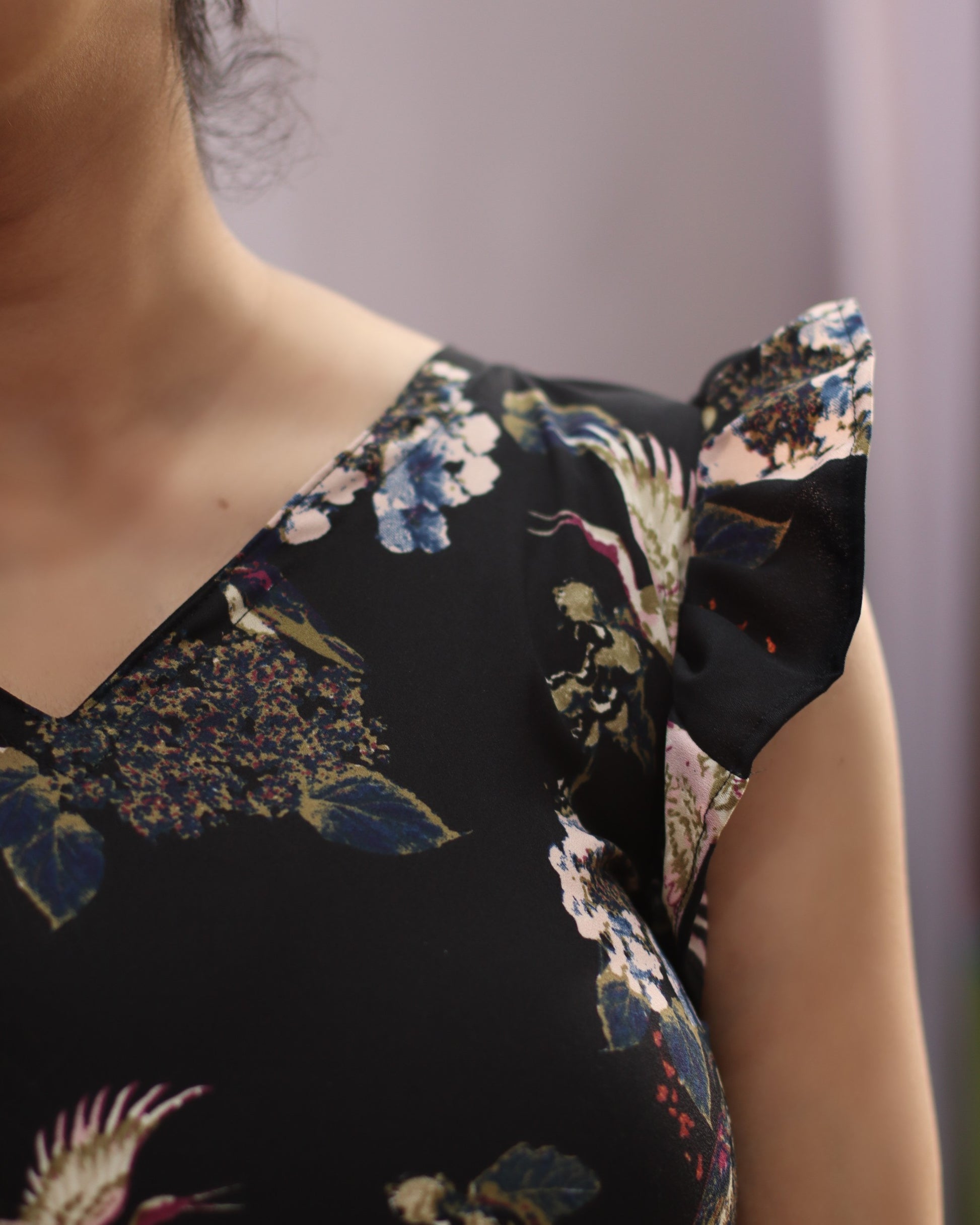 Black bird print pepulm top with delicate ruffle sleeves and a subtle V-neckline. The elegant dark floral print adds a touch of sophistication, perfect for both casual and semi-formal outings.