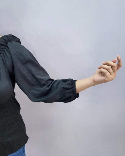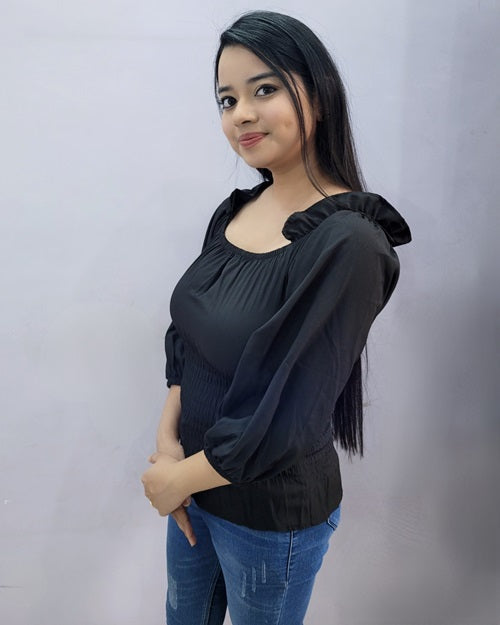 Black off-shoulder top with puff sleeves and frills at shoulder.