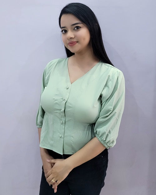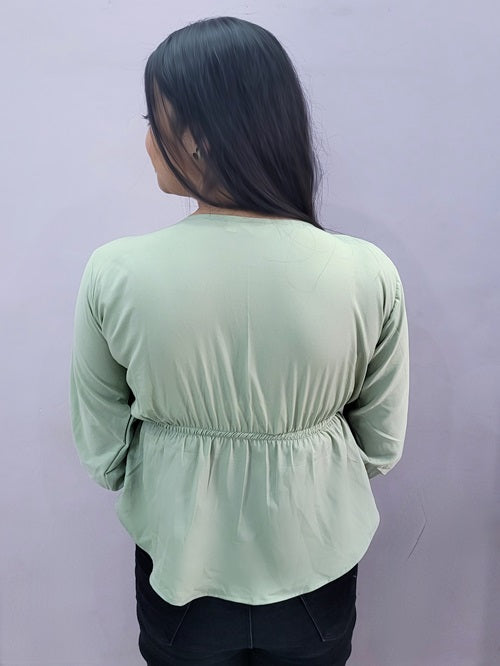 Pastel green v-neck top with buttons at front and lastic at the waist.