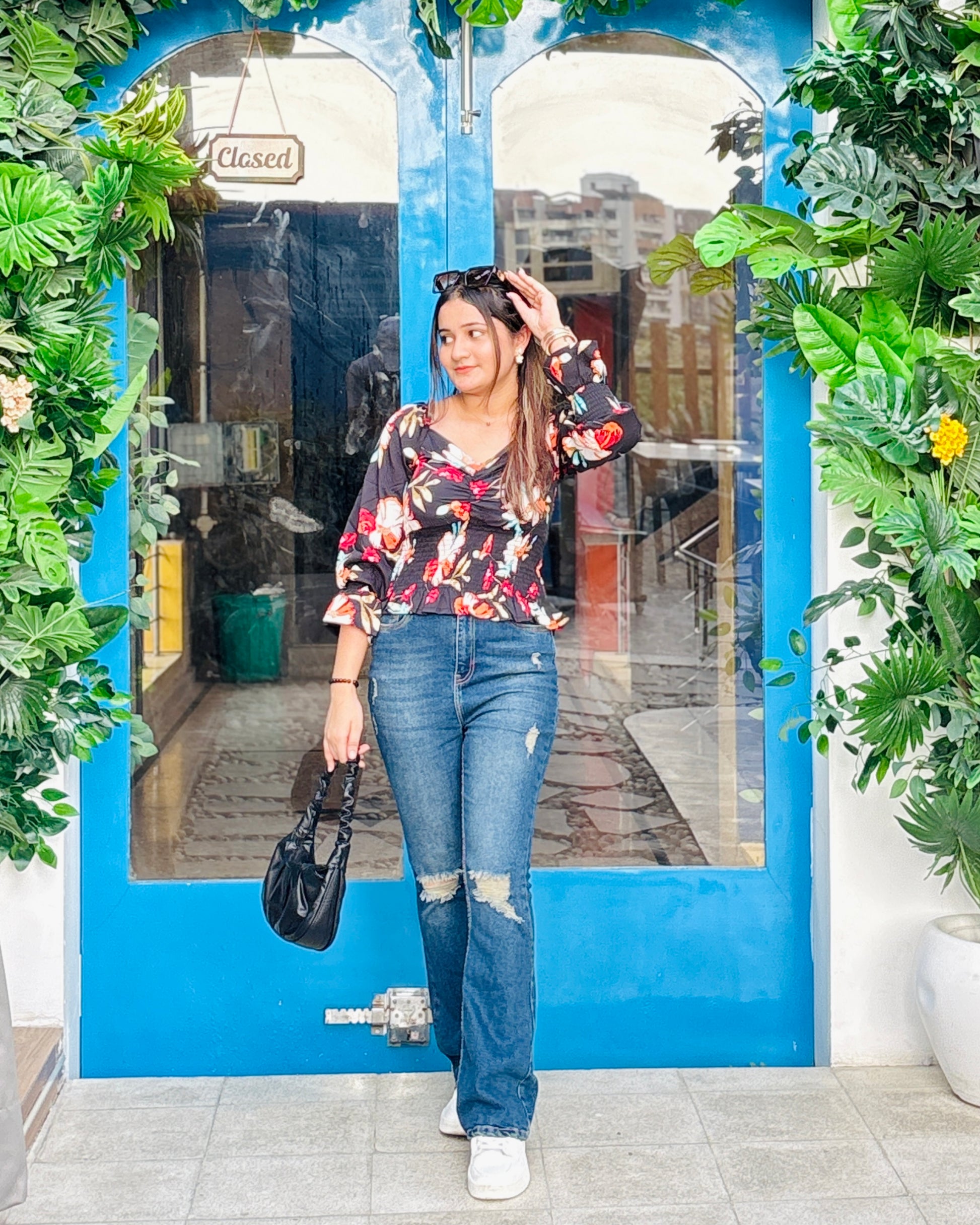 Black floral crop top with sweetheart neck, puff sleeves and smoke work at sleeves and waist. It can be worn off-shoulder as well.