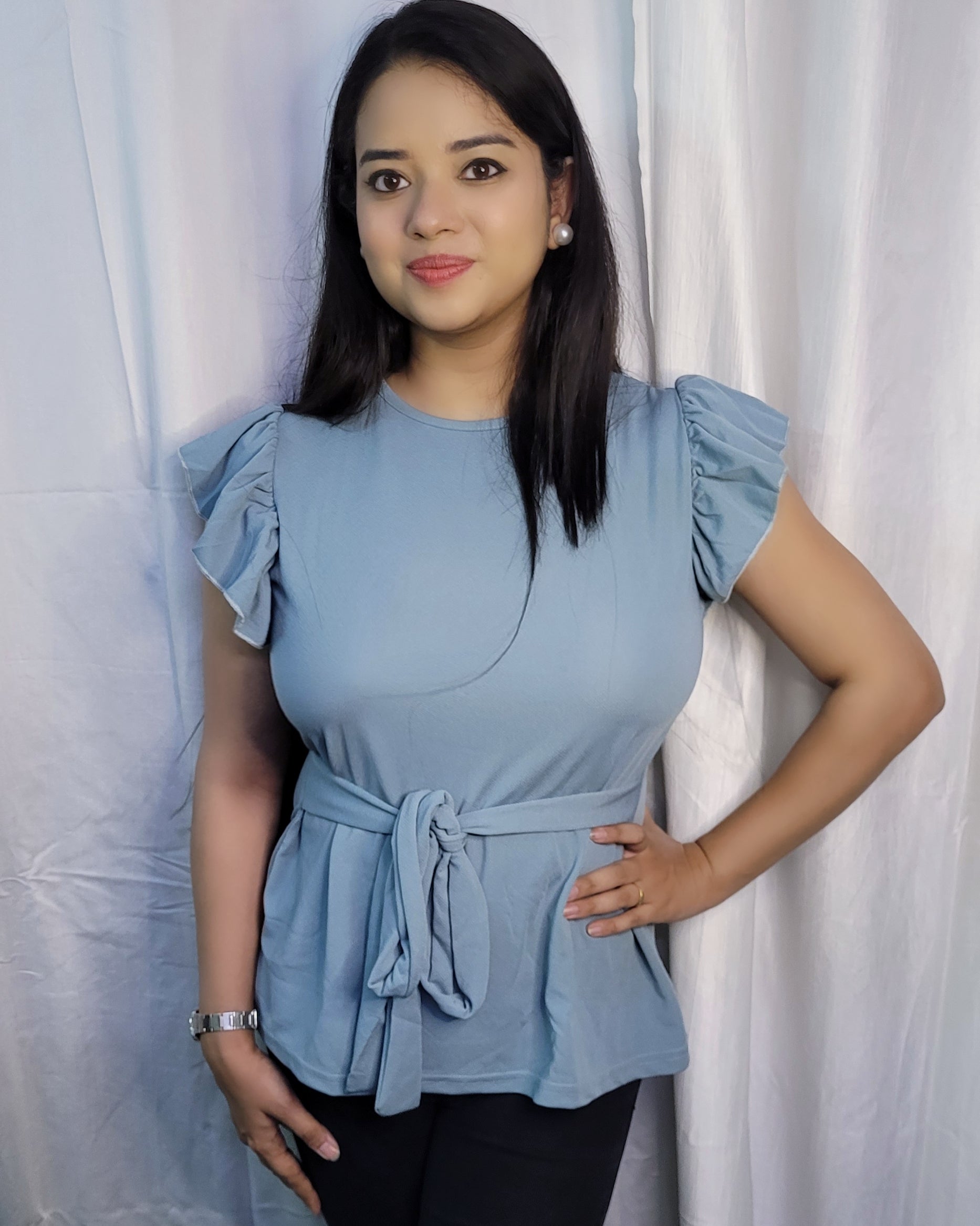 Blue straight-fit top with a belt at the waist and frills at the shoulder.