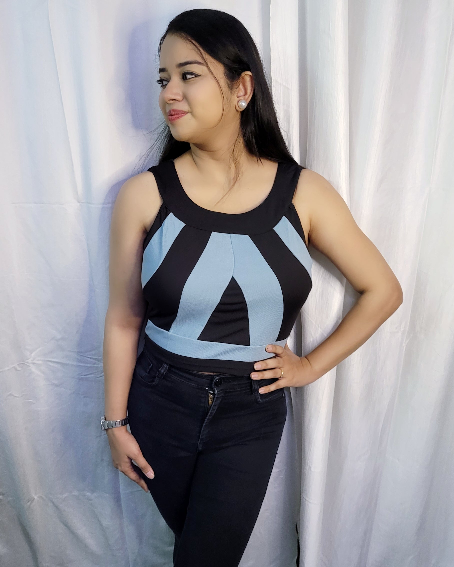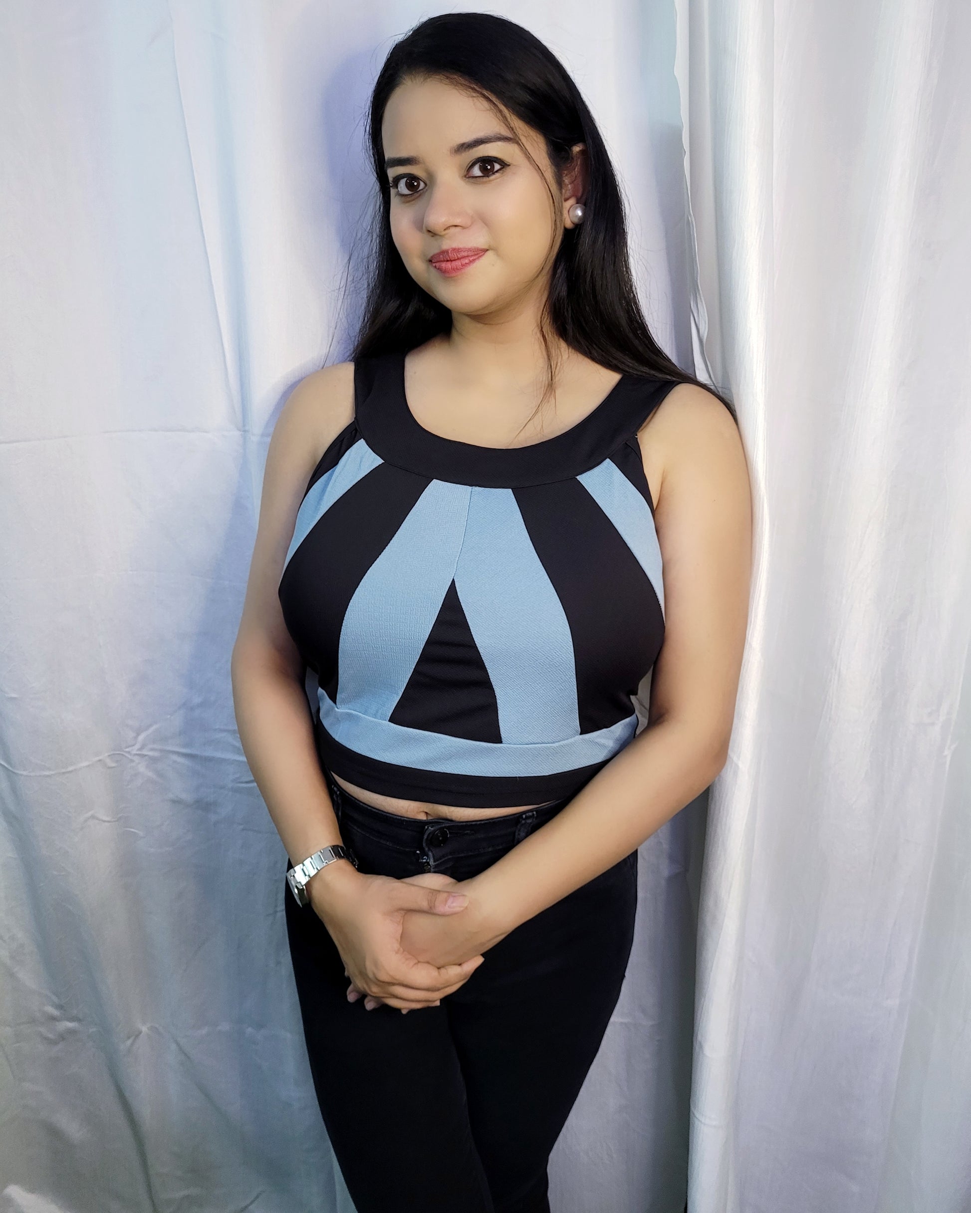 Black crop top with thick blue stripes at front.