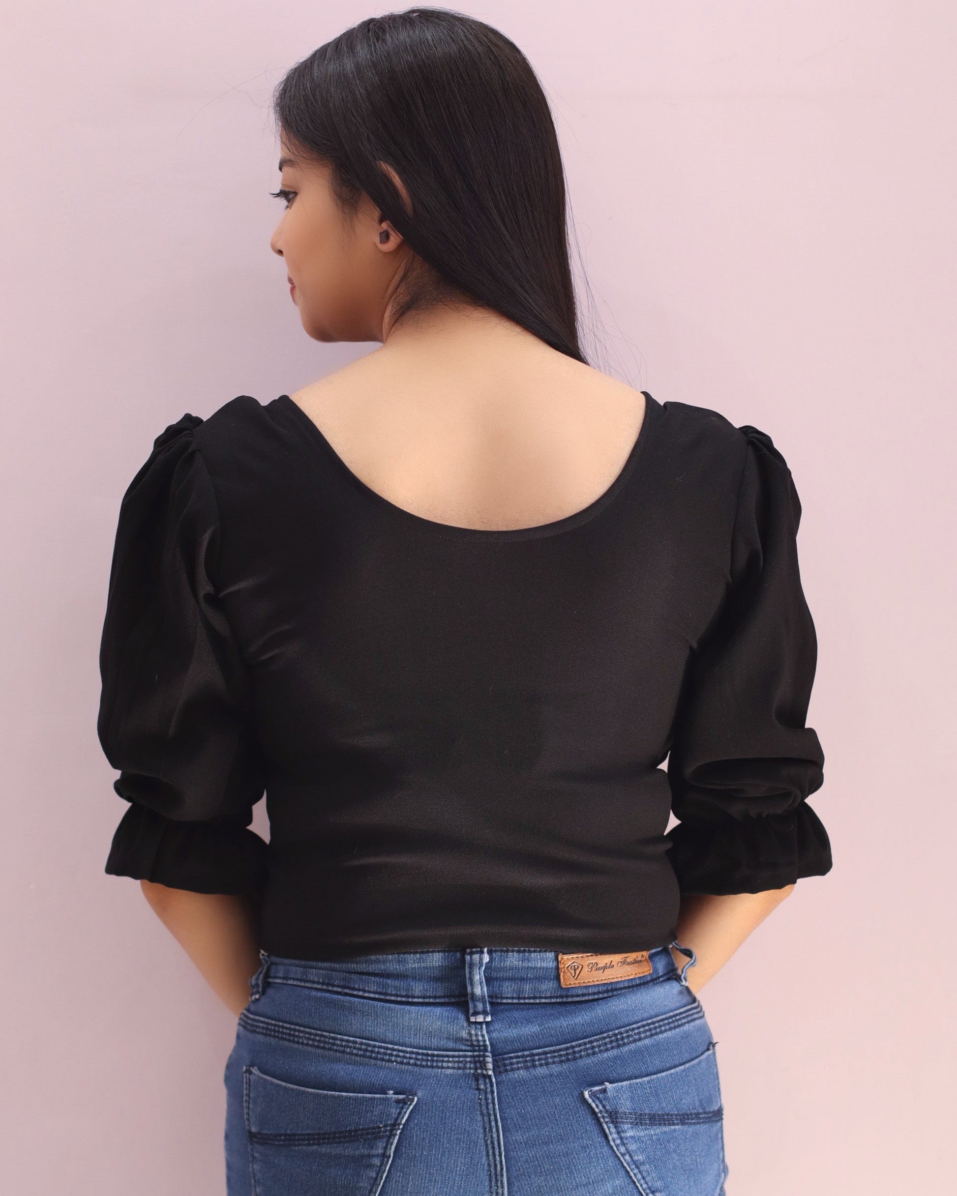 Black sweetheart neck crop top with puff sleeves and a belt at the side.
